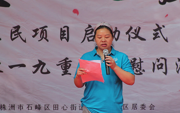 清风网湖南讯 (通讯员:刘嘉雯)2019年10月10日上午,在株洲市石峰区田心街道叫鸡岭社区6415小区的老年活动室旁,举行了“城乡统筹·幸福石峰”叫鸡岭社区“乐龄安享·情暖夕阳”惠民项目启动仪式暨2019叫鸡岭社区重阳文艺汇演,活动由叫鸡岭社区居委会主办,株洲市种子社会工作服务与发展研究中心承办,种子社工副总干事汤雪梅主持。在庄严的国歌声中,全员手持国旗起立,活动正式开始。