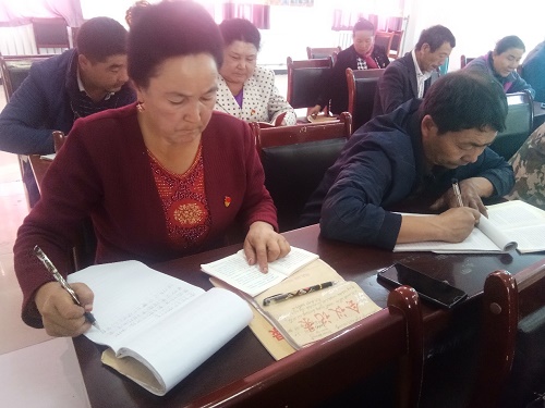 2019年10月12日,我村以自主学习开展主题教育,但是群众党员不约而同的来到村委会办公室。第二村民小组党员阿扎旦木·依斯玛依力直径走进村委会,小心翼翼的从包里拿出《党章》和学习笔记本,她左手紧按着《党章》学习的内容,右手一笔一划地写着,表情非常严肃,全身心投入学习。入党8年期间,她艰苦朴素的精神,认真对待生活的态度和自觉学习主题教育的行动,在我村群众党员中起到了积极推动作用。