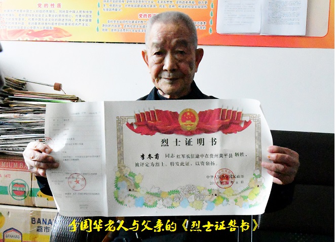 李国华老人的父亲叫李冬苟,是江西省永新县象心镇拓溪村人,生前为红六军团一名战士。1934年夏,湘赣苏区反“围剿”失利后,按照中央革命军事委员会“关于红六军团撤离湘赣苏区,到湖南省中部发展游击战争”的指令,红六军团成立了以任弼时为主席、肖克为军团长、王震为政委的军政委员会,率领红6军团0.97万官兵突围西征。部队先后突破国民党军在衙前至五斗江、遂川至黄坳、寒口至广东桥、文市、通道等地的围追堵截,于10月1日到达贵州黄平县新州镇太阳山下的金竹岩,并在这里与驻守在山头上的黔军王家烈部第一团和特务团展开激烈的战斗。红六军团从中午3时打到傍晚才将山头上的敌人击溃,随后又迅速向老黄平(今旧州城)进发。