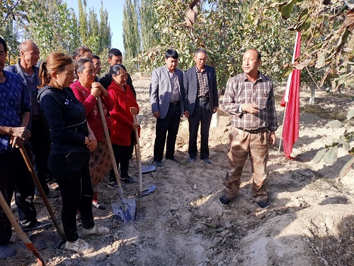 首先由农科站干部阿依木·沙吾尔同志为正在核桃地修防渗圈的群众讲解核桃树的修剪标准和防渗圈的具体要求。冬小麦种植技术。