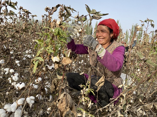 古丽且木·买买提也是一名拾花能手,一天能捡120公斤长绒棉。说起拾棉花的收入,古丽且木·买买提眼角带笑地说到:“一公斤长绒棉2.5元,一天捡120公斤,拾花收入是300块钱,收入不错啊!”