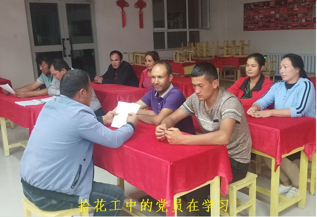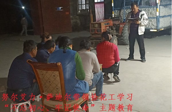 近期,阿克苏地区二中驻阿克切克力片区托格拉克买力村工作队走访到棉花种植户田耀峰家时,发现外来务工的党员们并没有因为一天疲劳的忙碌早早休息,而是在队长努尔艾力·萨迪尔的带领下认认真真学习。