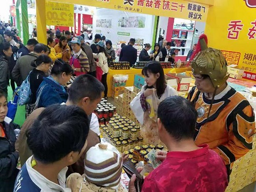 “近5年在长沙举办的农博会、旅博会,我们都积极参展,现在长沙人已喜欢上十三村香菇酱,今天来的都是老顾客,酱粉丝。”十三村公司总经理柳芳一边擦汗一边介绍情况。