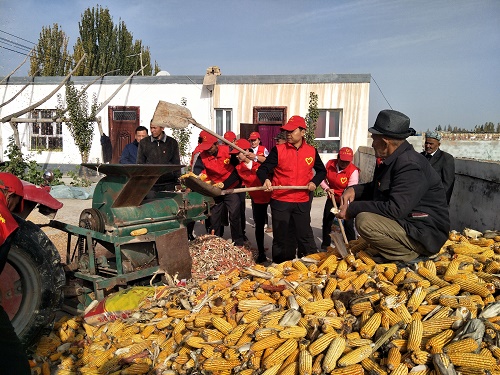 “谢谢大家,你们今天可是帮了我大忙,这些玉米要是靠我和丈夫2人自己进行脱粒,需要5、6小时,党的干部白克亚克西”。望着脱完的黄灿灿的玉米,阿依吐尔.托乎提激动地说道。
