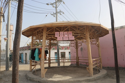 清风网讯(新疆农业大学驻村工作队:夏依曼尔丹·买木里 万洪波)新疆农业大学驻拜什艾日克镇代热亚博依村工作队,联合村两委于2019年7月在村民小巴扎投资6000元建立一座为村民等待班车和巴扎日闲逛休息的“爱心亭”。经过新疆农业大学“访惠聚”工作队和“村两委”商议,把它加工修饰,变成既供人休息又传递温暖送真情的“爱心衣架亭”。