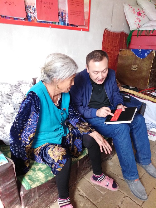 拜城县人社局驻察尔齐镇红旗村“访惠聚”工作队队员们来到红旗村1组60号阿提汗`巴拉提房子,将十九大学习资料送到老党员手中,细心地为他讲解,将党的声音及政策传递给他。阿提汗·巴拉提激动地说:“我现在年纪大了,不方便出门,“不忘初心 牢记使命”主题教育活动开展以来,村里的“访汇聚”干部定期来我家给我传达学习内容,帮我做做家务,解决困难。虽然身体不好的原因近期没有参加党组织活动,但我心里一直惦念着党,……我非常感谢党组织的关心和关怀。
