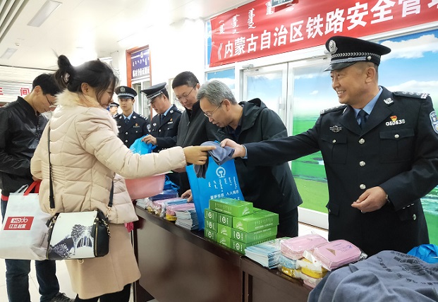 清风网讯(通讯员:赵娟)为广泛宣传《内蒙古自治区铁路安全管理规定》,增强广大旅客群众爱路护路和铁路安全防范意识,2019年11月12日下午,锡林浩特铁路公安处联合锡林郭勒盟政法委、锡林浩特安监大队、车务段、锡林浩特护路联防办公室在锡林浩特站候车厅开展爱路护路宣传活动。