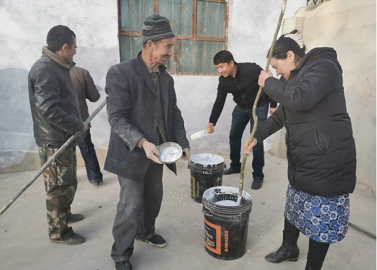 71岁的贫困老人艾麦尔·玉苏甫喜得合不拢嘴,他高兴对我们说:“我们夫妻二人年事已高,唯一的女儿常年不在身边,现在不但住上新房,在工作队、村委会干部、党员的关心照顾下,在百忙当中帮我家粉刷院墙,我要感谢党和政府培养的这些好干部、好党员 ,使我们一家人过上了幸福的生活”。