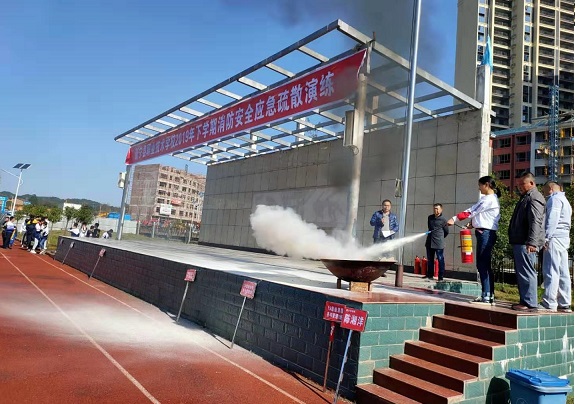 疏散演练结束后,政教处老师向全校师生讲解、示范了干粉灭火器的正确使用方法,并安排师生代表上台实际操作。随后,主管学生工作的副校长讲授了交通安全、防火、用电知识以及面临突发性事件,如何沉着应对、及时报告,有效掌握在危险环境中迅速逃生、自救、互救的基本方法。