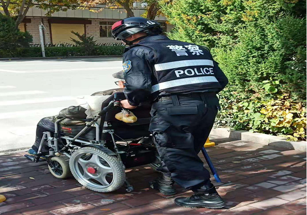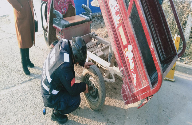 2019年11月17日,北大桥便民警务站在卡点开展日常执勤时,发现一辆电动三轮车在路边停着,车主看似很着急。队员立刻上前询问,得知电动车轮胎出现问题需要更换。队员立即行动,手把手帮助群众将轮胎换好,为群众解决了难题。队员叮嘱群众为自身安全出行前一定要检查好车况再上路。群众表示感谢,说:“你们辛苦了,你们是最可爱的人,我们为你们点赞!”