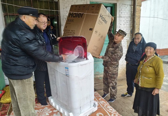 清风网讯(新疆维吾尔自治区人民检察院:王岳 王勇)近日,对于拜城县赛里木镇布干村70多岁村民艾买提·依布拉音老人一家人来说可谓是喜事连连,国庆节前他们一家才搬进富民安居房,今天又从驻村工作队长拜合提牙尔·吾拉木手中接过一台崭新的海尔双桶洗衣机,他激动地对拜合提牙尔·吾拉木说:“请您一定向我的亲戚何宝江总队长转达谢意,谢谢他送给我们家洗衣机!”,随后他深深地鞠躬,向一直以来关心和帮助他的驻村工作队员和村干部表示感谢。