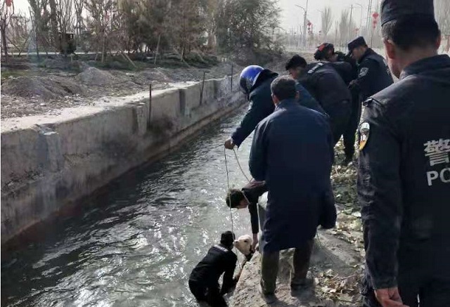 派出所接到警情后,立即组织民辅警前来开展救助。正值沙雅县冬灌用水高峰期,托依堡大渠作为全县灌溉主干渠,水量大、流速快,两头牛虽然不断挣扎嘶叫,但依然被水流快速冲向下游。民警数次想接近两头牛,都因渠深、水急而失败。湍急的水流中,民警赵庆波突然发现大牛的犄角上绑着绳环,他当机立断,组织救助人员驾车赶到下游。提前找到救助的有力位置,将两名民警腰上绑绳做好防护措施,当两头奶牛顺水漂来时,抓住大牛犄角上的绳环,众人齐心协力把大牛拉到岸上。将大牛交给参与救助的群众看护后,民警又立即拦截仍在漂流的牛犊。