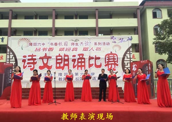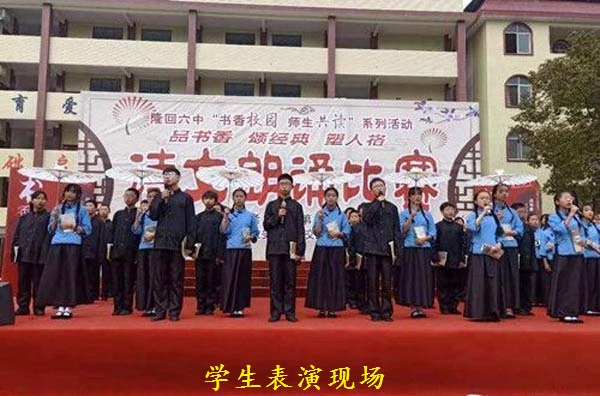 此次比赛分为初中组、高中组、教师组,采用现场亮分的方式进行。邻近的家长们得到消息,也赶来为自己小孩化妆、呐喊加油,比赛中师生们尽情展示自我,每一组参赛选手声情并茂,落落大方、气质高雅,一段段暖心的诵读,一张张喜庆的笑脸,得到了观众们一次次热烈的掌声。