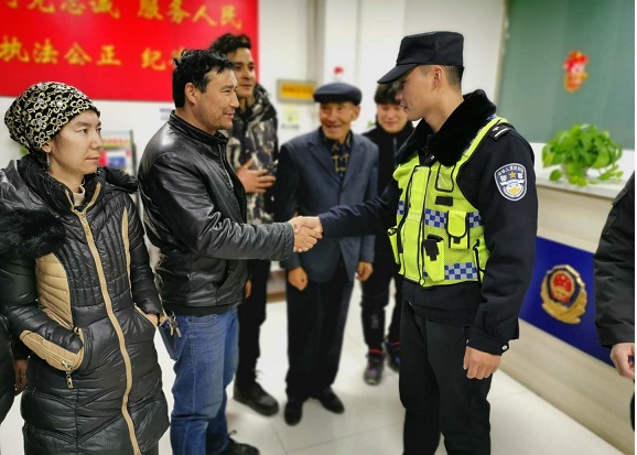 庆幸的是老人身上还装着身份证,民警经过核查,确认是外地户籍。按着核查到的亲属进行联系后,依然不能联系上老人的亲属。看着时间已经是凌晨4时,民警边将老人安置在宿舍休息,边通过110指挥中心报警台进行报警消息查找。功夫不负有心人,经过不懈努力,终于在凌晨5时30分从110指挥中心报警台得到反馈消息:确认县内居民有人报警老人走失。很快民警黎袁与报警人牙生·甫拉提取得了联系,并确认在宿舍休息的老人正是牙生·甫拉提走失的父亲。半小时后,牙生·甫拉提带着全家人接回安然无恙的父亲。满怀激动和感恩之情的他,不住地向民警表示着感谢。