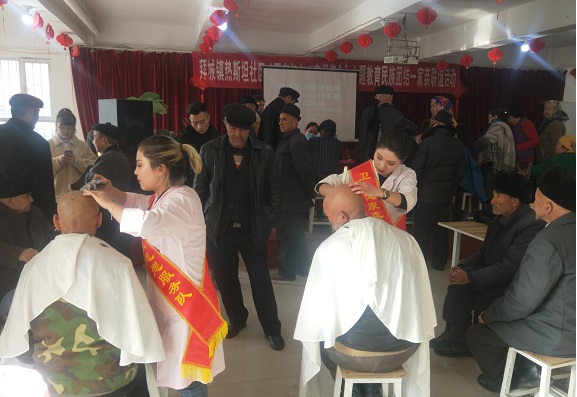 清风网讯 (拜城县卫健委:孙常萍 韩丽君)11月29日,拜城县卫健委机关党员干部、县域内私立医疗机构及五小场所行业代表等30余人,组建卫生健康志愿服务队在拜城县热斯坦社区开展了“献爱心、送温暖”主题党日实践活动,此次活动主要是为辖区的群众提供测量血压、宣讲健康防病知识、理发等志愿服务,活动现场前来问诊和理发的群众络绎不绝。