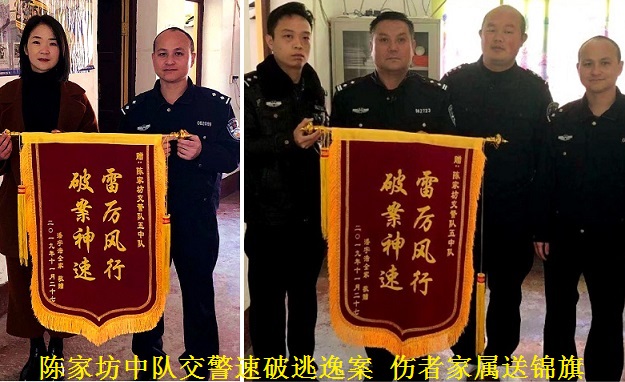 功夫不负有心人,协查发布的第二天,民警肖欣就收到某村驻村辅警的消息,图片上的肇事摩托车司机是太芝庙镇人,在陈家坊镇某村长住。中队长夏金波得知后,马上安排副中队长石利军和民警肖欣赶到陈家坊镇某村的一出租屋内,现场抓获了肇事驾驶员并找到肇事摩托车辆。至此,“10.27”交通事故肇事逃逸案成功告破。于是,便有了文章开头伤者家属送锦旗的那一幕。