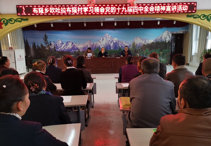 清风网讯(自治区烟草专卖局:牙力坤·亚森)按照拜城县“与法同行”宣讲活动实施方案,2019年12月5-9日,布隆乡欧吐拉布隆村结合今冬明春全员“大培训、大宣讲”活动,针对农牧民党员、致富带头人、贫困户、青年等各类群体深入开展认真学习领会党的十九届四中全会精神宣讲活动。