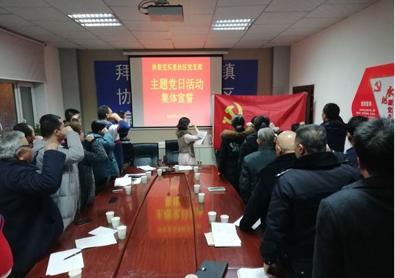 组织生活会共设置了四项议程。第一项议程由协里克买里社区党支部书记陈静代表党支部做了一年来支部工作的检视、剖析存在的问题的阐述。她从强化党员的组织学习,社区服务功能,党员的组织纪律和存在的问题整改措施四个方面做了深刻、详细的汇报,为新一年的党支部工作指明了前进的方向。第二项议程是社区左秋香和张俊智等七名两委班子成员分别就对自己二零一九年全年工作进行了认真的检视和剖析,查摆了自身存在的不足,开展了自我批评,其他党员逐一对两委班子成员给予了诚恳的批评,大家坦诚相见,开展批评与自我批评,达到了红红脸、出出汗的效果,社区班子成员及党员对自身存在的问题有了更加深刻的认识,明确了下一步整改措施、努力的方向,也真心达到了团结—批评—团结的目的。第三项议程进行了全体党员的民主测评环节,通过民主评议,正确评价每个党员在学习和完成岗位职责任务的过程中发挥先锋模范作用,并对照党员标准在肯定成绩的同时,找出存在的问题,明确今后努力的方向。最后一项议程进行了主题党日活动集体宣誓,全体党员面对党旗,再次举起了右手,铿锵有力的铮铮誓言,表达着党员的雄心壮志和使命担当,为决胜全面小康,实现中国梦凝聚起了必胜的雄心和磅礴力量!