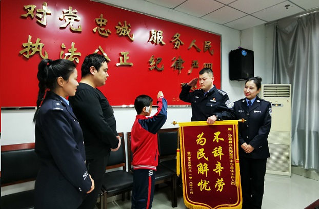 清风网讯 (通讯员:窦明媛 徐纪)12月16日上午12时许,沙雅县城镇居民阿里木·外力江带着10岁的儿子前来为沙雅县公安指挥中心全体民辅警送来锦旗。当小热依木江·外力江郑重将锦旗亲手交给民警后,立即又用少先队礼向民警致敬,民警也立即给予庄重的回礼。为民初心和使命,在二人的敬礼与回礼中再次得到滋养和茁壮成长。