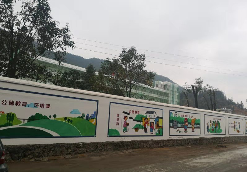 文化墙作为农村文化建设、传播文明风尚的重要载体,以群众喜闻乐见、通俗易懂的方式,引导农民树新风、倡新风,围绕社会公德教育、“不忘初心、牢记使命”主题教育、社会主义核心价值观、传统文化等内容,积极践行乡村振兴发展战略,倡导文明道德新风尚,让广大村民在欣赏墙绘时能在潜移默化中受到教育和影响,促进广大村民自觉遵守社会公德、树立卫生整洁、勤俭节约、勤劳致富、崇尚科学、遵纪守法、诚实守信、崇德向善新风尚,提高自身修养。