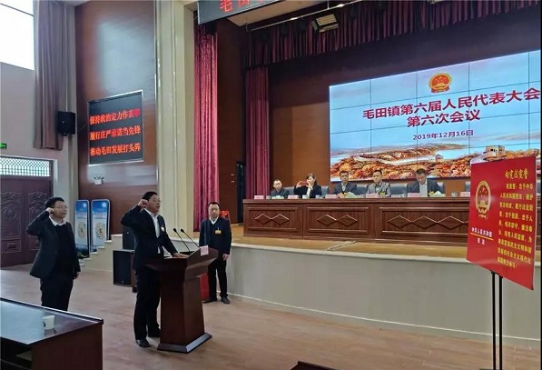 毛田镇第六届人民代表大会第六次会议在庄严的国歌声中拉开序幕。大会选举产生了一名副镇长,陈颖同志以69票满票当选。选举结束后,陈颖同志面对宪法作就职宣誓。
