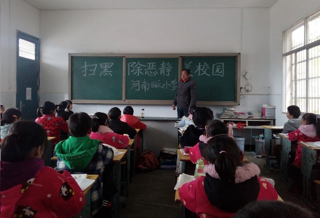 据悉,三门河中学、河南畈小学、东夹铺小学、六西冲小学四所学校,“有黑扫黑、有恶除恶、有乱治乱、固本强基”、“扫黑除恶 纯洁校园”等宣传标语赫然醒目、到处可见。各学校还通过与教师谈心谈话、签订承诺书、主题班会、国旗下讲话等方式全方位进行扫黑除恶专项斗争宣传,营造了扫黑除恶人人有责、全员参与的良好氛围。