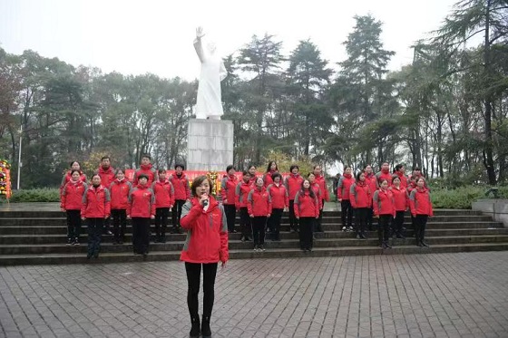 首先,师生代表向主席敬献花篮,全体在场人员向毛主席塑像三鞠躬,齐唱《东方红》,来表达对主席深深的缅怀之情。接下来,学校党支部书记、校长向燕致辞,希望全体师生用诗传情、以诗祝寿,牢记主席教导,传承红色基因,争做时代新人。