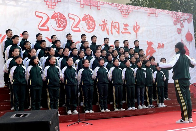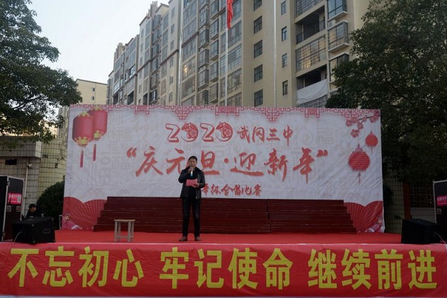 清风网邵阳讯(通讯员 张治龙 段媛 蒋武林) 为丰富校园文化生活,弘扬爱国精神,喜迎2020年元旦,12月27日上午,武冈三中在操场举行“庆元旦 迎新年”七年级合唱比赛。