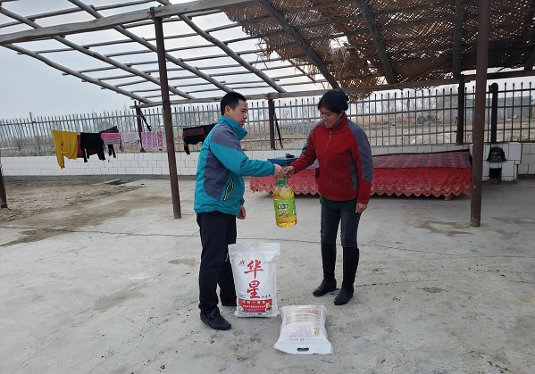 在前期走访入户、调查了解的基础上,工作队筹资3000元购买了大米、清油、面粉等慰问品,有针对性的选择了14户困难群众、老党员、老干部、结亲对象进行走访慰问。