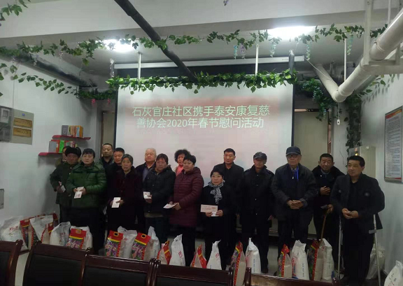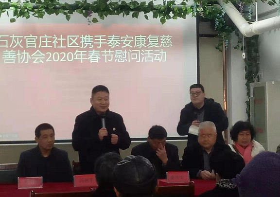 山东泰安1月22日讯(韩庆全 刘承利 刘培龙)2020年1月20日,由泰安市高新区石灰官庄社区主办,泰安康复慈善协会协办,泰安仁福医养中心院长陈同海,带领医生们,现场为石灰官庄社区困难家庭捐助价值1280元的健康体检卡, 济南划时代新能源科技有限公司为困难群众每户捐助了米和面,温暖了贫困户的心。