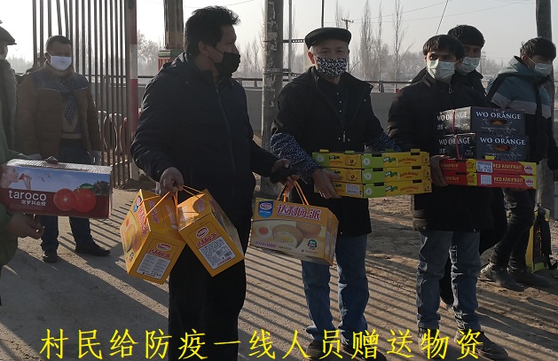2月1日,在阿克艾日克村二小队路口检查站,村民伍星河见数日来辛苦坚守在检查站疫情防控一线岗位的志愿者和巡防队员们非常辛苦,每天忙着工作顾不上吃饭,便将家中的水果、饼干、矿泉水等食品物资赠送给工作人员表示感谢,向一线的疫情防控人员送去暖心慰问。