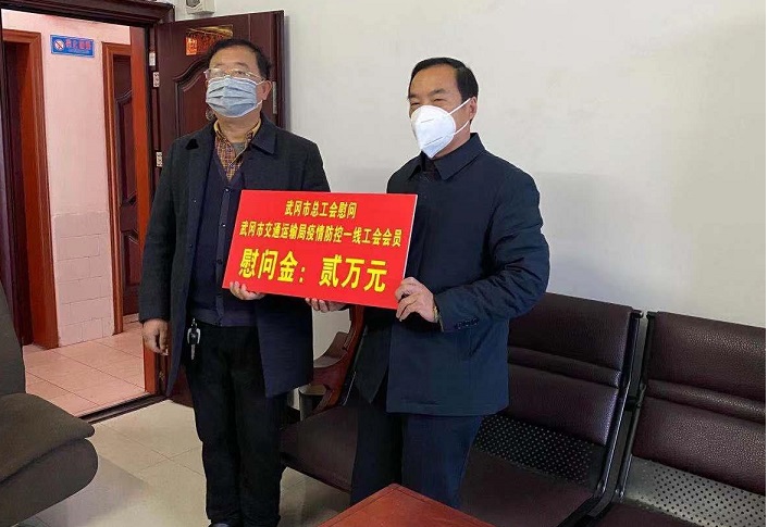 清风网邵阳讯(通讯员 周彬 沈程军 舒程) “希望大家继续发扬不怕苦、不怕累的精神,全力筑牢疫情防控‘防火墙’,坚决打赢这场疫情阻击战。”2月2日,武冈市总工会向奋战在疫情防控一线该市交通运输局工会会员赠送慰问金贰万元,把党和政府及工会组织的温暖、关怀送到坚守防疫抗病岗位一线工作者的心坎上,同心协力、众志成城战胜病毒疫情。这也是武冈市爱心助力疫情防控的暖心的一幕。