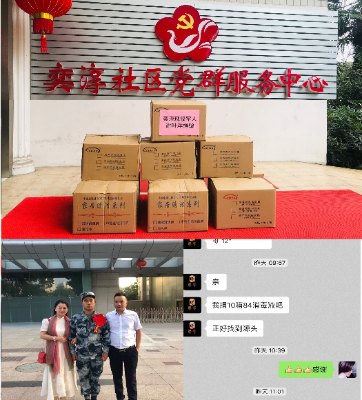 当前,新型冠状病感染的肺炎疫情防控进入攻坚期,社区疫情防控物资紧缺。新吴区现役军人谢叶洋通过快递“货拉拉”为社区送来了“84”消毒液,用于疫情防控一线人员自身的保护工作。“我是一名现役军人,虽然远在他乡,通过各级新闻媒体,能感受到社区一线社工的辛勤付出,这个时候一定要力所能及为自己的家乡抗击疫情做点事情。”