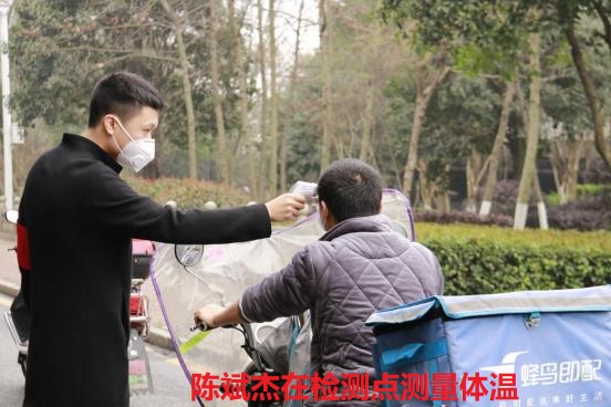 在西湖桥社区广电影城检测站,就读于湖南省职业艺术学院的大三学生陈斌杰,戴着口罩和红袖章,正在有条不紊地挨个测量行人体温,他早上7点半准时到达,中午吃个简单的外卖,又接着和其他志愿者一起值守到下午6点半,晚上则抽时间上网课,为今年的教师资格证考试备战。据了解,该志愿者妈妈在基层一线疫情防控工作,从大年初二开始就没有休息过一天,于是他萌生了和妈妈一起去战斗的决心。陈斌杰说:“我作为一名即将走向社会的大学生,在这个关键时刻当一名志愿者,也是新时代大学生应有的一份社会责任。”据一起值守的志愿者说,有一次,一位大伯怎么样都不配合测量体温,强行推开陈斌杰就往前走,陈斌杰一边追喊一边宣讲,一直追了100多米,终于测量到了36.6°的体温,他这才放心地拿着体温枪跑回检测点。他在值守点的口头禅就是“一个也不能漏过,万一呢?”就是这个“不怕一万,就怕万一”的态度,陈斌杰每天测量5000余名通过检测点人员的体温,每天在同一地点的步行达1.2万步。