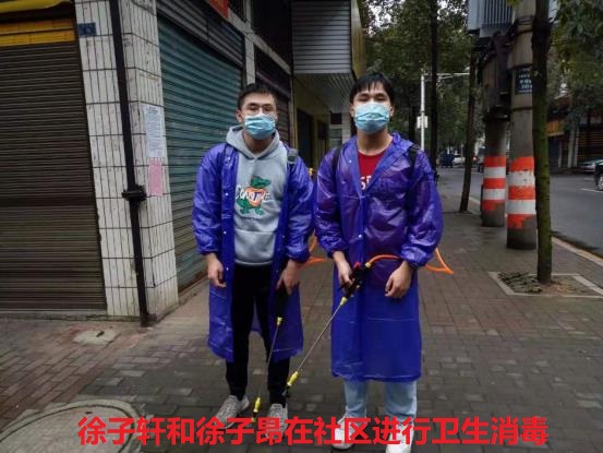 在资园社区农贸市场和居民小区,一对19岁的双胞胎徐子轩和徐子昂,他们是湖南工商大学和湖南铁路科技职业技术学院的大一学生。此时,他们背着沉甸甸的喷雾器正在为社区60多栋居民楼进行全面消毒。爸爸徐波是社区干部,大年初一就毅然投入抗击新冠肺炎疫情工作中,看着父亲不分昼夜地摸排走访、宣传值守,听着疫情防控工作进入关键时刻,两个孩子看在眼里,急在心里,想为父亲分忧解难,想为社区工作添柴加火,于是两兄弟一商量,不约而同地加入到社区志愿者队伍中来。 资园社区人员密集,人流量大,共有200余栋居民楼,消毒任务重、事情急,为保障疫情防控需要,徐子轩和许子昂和其他志愿者一起加班加点在2天内圆满完成整个社区的消毒任务。“参加疫情防控,不仅能为社区做贡献,还锻炼了实践能力和水平。”这两名大一的志愿者如是说到,并表示志愿服务会一直持续到开学前一天。