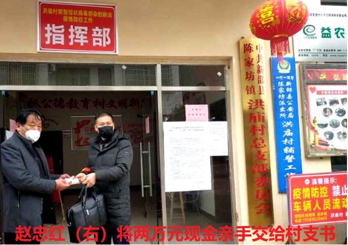 清风网邵阳讯(陈家坊镇 刘志坚 黄能果)2月29日,新邵县陈家坊镇洪庙村热心企业老板、村志愿者赵忠红大清早安排公司复工人员工作后,自己就戴上执勤袖章来到村新冠病毒防疫指挥部值班,并亲手将两万元现金交给了村党支部书记赵楚华,用于支持村里的疫情防控工作开展,以表达自己的一点心意。 “在这最关键的时刻,你为家乡疫情防控开展奉献爱心,我们真的非常感动,我代表家乡父老乡亲表示诚挚的感谢!” 该村支书赵楚华激动地说。