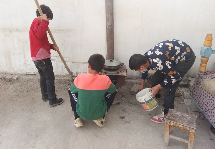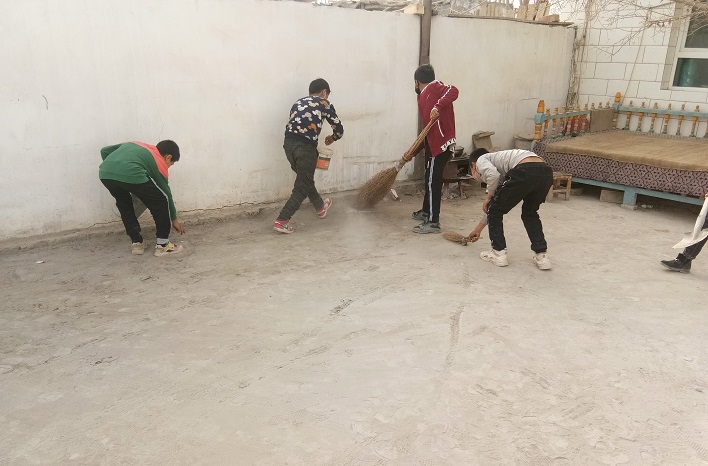 小志愿者们不怕脏、不怕累,拿扫把的、提桶的、挥锹的,井然有序地将院子各处垃圾死角的小木棒、纸屑、杂物等清扫干净。在他们的齐心协力下,月尔尼萨汗·玉散老人家的院子很快变得干干净净、焕然一新。