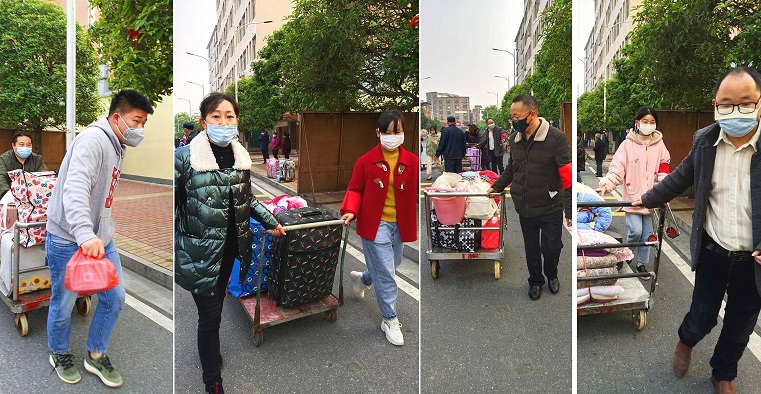 该校毕业班共1400余人,其中初三学生近1000人,高三学生400余人,预计每生人平只带2件行李,行李就达1400余件,入校时每个学生还需测温、消毒、观察等,更不便携带行李。于是,4月5日上午,学校号召老师自愿成立志愿者队伍为学生接送行李,号召一发出,老师们积极响应,赵艳华、朱建江、沈学娟等30余名老师踊跃报名。