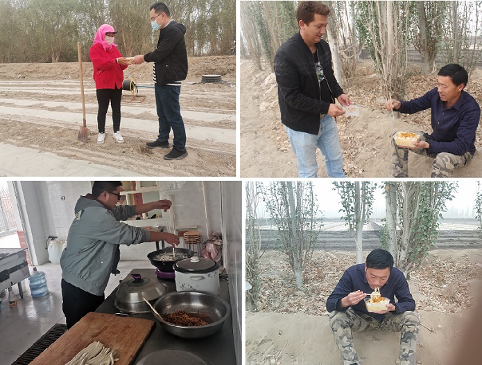 4月17日晚工作队队员张晶开玩笑说道:“肉孜,你炒的烩菜不错,明天做个拉面,你看现在他们这么忙,中午就是吃点馒头配咸菜,要不你明天炒个烩菜让他们尝尝,刚好这几个村干部就在我们这边地里干活。”肉孜·艾山说;“就是,明天中午做个拉面,拌个凉菜给他们送过去,减轻他们的负担,给他们送一顿爱心午餐。”。