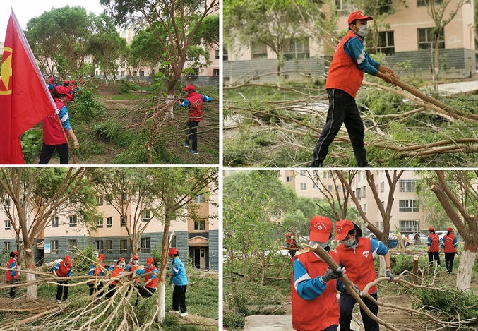 清风网讯(阿瓦提镇锦绣社区:海立)为解决锦绣社区辖区里树枝茂盛遮挡居民楼窗户,遮挡阳光,搭连电线造成安全隐患。2020年4月17日星期五社区利用志愿者服务活动时间果断发动民兵、志愿者服务队和共建单位三中团支部,联合解决这一“心头之患”。