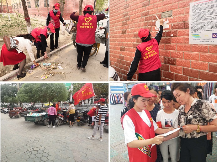 居民志愿者阿孜古丽·阿布拉说“今天我们开展志愿者服务活动,对胜利社区环境卫生进行了大扫除,净化美化了社区环境,心情非常愉快,度过了有意义的一天”。