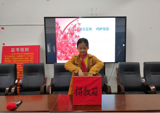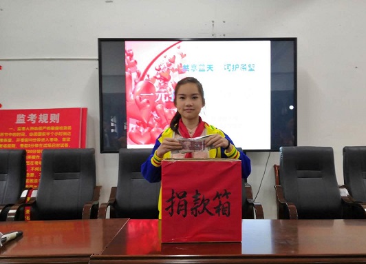 在“只要人人献出一点爱,世界将变成美好的人间……”歌曲声中,各班班长纷纷拿出本班同学的捐款奉献爱心。一元、两元、五元……小小的钞票,拳拳的爱心饱含了学生们深厚的的情谊,传递着爱心与希望。