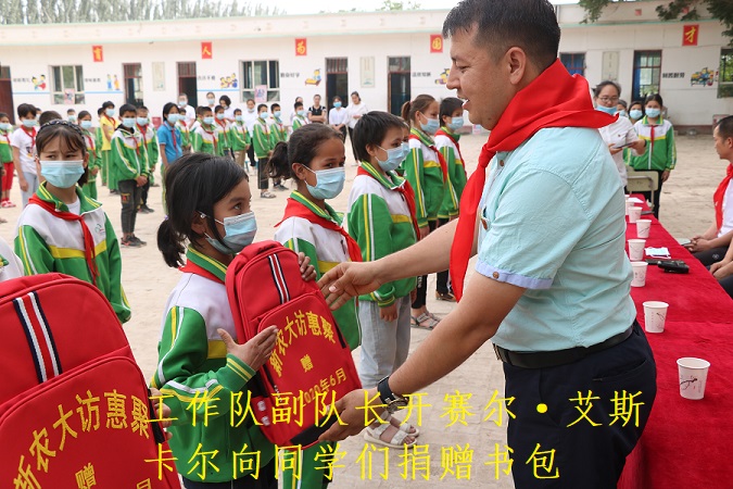 首先由学生少先队员代表为驻村工作队员和结亲干部敬献红领巾!驻村工作队副队长开赛尔·艾斯卡尔代表工作队致辞:你们是祖国的未来,是中华民族的希望,在六一国际儿童节即将来临之际,新疆农业大学“访惠聚”工作队为祝贺小朋友们欢度节日,特筹措资金,为每一位小朋友赠送书包!希望同学们好好学习,天天向上,热爱生活,懂得感恩,与人为善,明礼诚信,学好本领,报效祖国!