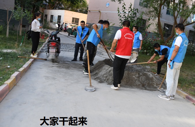 随后,各单位的领导和在职党员、社区干部、“访惠聚”工作队身穿红马甲、蓝马甲,和物业高经理一起,带上了铁锹、铁锤等工具一同来到锦绣花园小区主动当起了修路工人,着手解决锦绣花园小区1号楼、2号楼地面裂缝的问题。一旁的居民也没有袖手旁观,都自发的当起了志愿者,一同参与到修路的工作中来。大家分工协作,有的抡着铁锹将一块块路面坑洼的砖块启开,有的几人一组奋力搅拌水泥、有的拉水管浇湿地面、有的搬运水泥沙子,将拌好的水泥均匀地铺到地面上,最后再用铲子将地面抹平,并围蔽起来。经过大家的共同努力,路面恢复了平整,交通也变得更加顺畅了。道路修复后,得到居民的一致"点赞"!