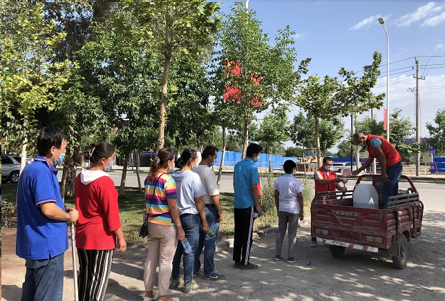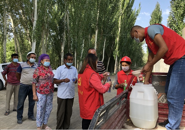 清风网讯(沙雅县沙雅镇幸福社区: 莫苗苗)“哎呀,我出来的急身上没有带钱,我回家拿上钱再来买消毒液。”居民亚森·热合曼说着便转身准备走了。“大哥,我们是幸福社区的志愿服务者,这是免费给大家伙发放的消毒液,社区都稀释兑好了,拿回家用,用完了您再跟我们说,我们给您再送。”志愿者奥布力·卡斯木一边给居民分发消毒液,一边解释说道。
