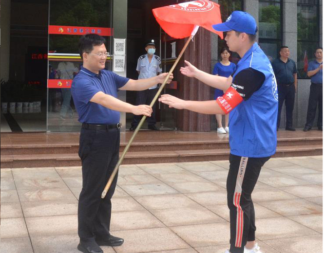 清风网讯(特约记者 常魁星 通讯员 郭初雄 蒋倩 )在八一建军节前夕,7月28日上午,江西建工集团“平安江西”志愿者授旗仪式在江西建工大厦广场举行,集团党委副书记、董事缪圣刚为建工一建、二建、三建、四建、建工安装、建工机施、建工产投和建工机关等8个单位志愿者授旗。