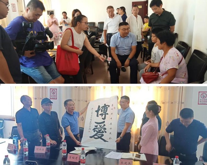 捐助仪式上,老粮仓镇党委副书记,镇长熊建兵致欢迎词,熊书记对受助学生寄予了深切的厚望,并对爱心企业表达了衷心的感谢,爱心企业湖南康联国际贸易有限公司董事长陈波星讲话,陈总代表集团全体员工转达了对受助学生的关怀,并表示今后会提供更多的支持和帮助。另外曾昭才先生作重要讲话,对爱心企业捐资助学的善举给予高度肯定,对受助学生赋予深切厚望,希望这些学子在学业有成后,用自己的行动证明传递爱心,回报社会,他还给爱心企业及老粮仓镇政府捐赠书法作品3副“中国梦”、“博爱”、“乡村振兴”。中国雷锋报长沙县工作站执行站长欧文光,副站长罗鑫参加了本次捐资助学活动。其中还有两家企业获得“扶贫助学先进单位”,一个社会贤达人士获得“扶贫助学先进个人”,活动在《爱的奉献》歌曲声中倾情闭幕。(叶文波、袁坤)