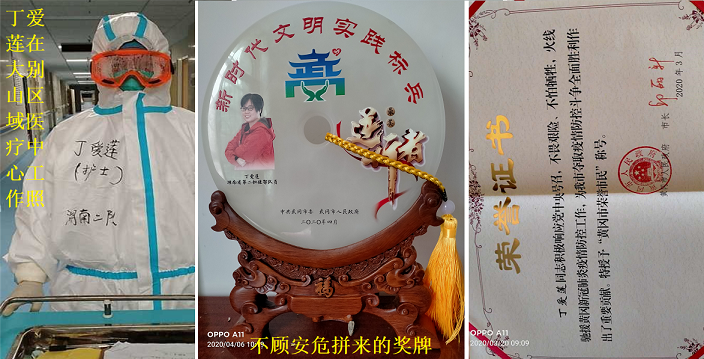 新冠肺炎疫情发生后,湖南武冈市人民医院丁爱莲主动加入湖南医疗队,与137名医护人员毅然决然驰援湖北省黄冈市,她和自己同事不顾个人安危逆行前往,期间连续工作50多个日日夜夜,不仅利用肺康复治疗救活病人,而且首次成功解决好护目镜起雾问题,荣获“黄冈荣誉市民”、“2018-2019年度邵阳市抗疫一线青年岗位能手”、武冈市“新时代文明实践标兵”等称号。