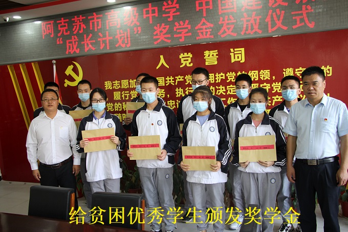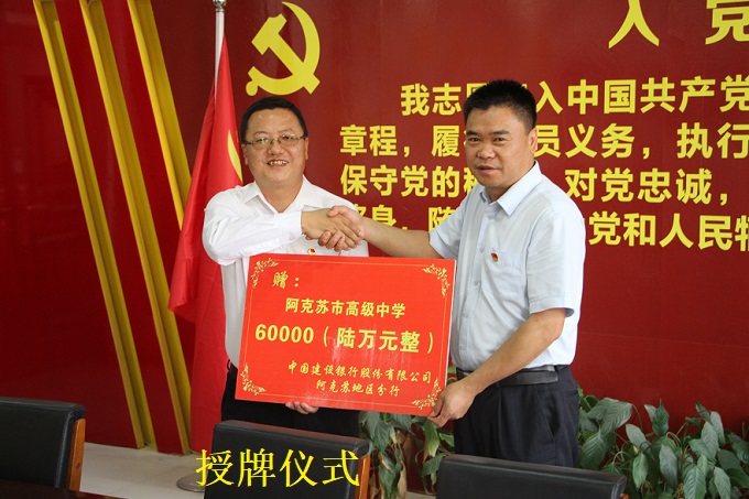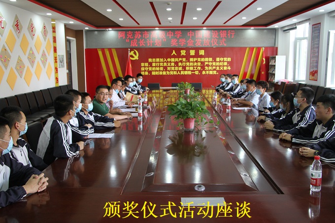 清风网讯(阿克苏市高级中学 : 杨郧新 楚君)秋日公益行,真情暖校园。9月18日,中国建设银行股份有限公司阿克苏地区分行领导一行赴阿克苏市高级中学举行“成长计划”奖学金颁奖仪式,向我校20名家境贫困的优秀学生捐资6万元,其目的是减轻家境贫困学生在学习和生活上的压力,助力他们健康成长,将来成才。中国建设银行股份有限公司阿克苏地区分行党委委员、副行长黄飞,个人金融部总经理吐汗古力·瓦依提,阿克苏市高级中学党支部委员、副校长杨郧新、张伟及相关人员共同参加了此次颁奖仪式。
