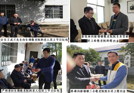 又要到一年重阳节了,2020年10月23日,农历九月初七,距离传统九九重阳节还有两天,但多年来一直心系敬老院老人们的岳阳市陶瓷行业商会岳阳县分会的会员企业老总们在百忙之中抽出时间,在岳阳市陶瓷行业商会会长&湖南亚泰陶瓷有限公司董事长王成兰和岳阳高新技术产业园领导的组织下,商会副会长&湖南天欣科技股份有限公司董事长童垸林、副会长&湖南宏康陶瓷有限公司总经理严伟香、监事会副主任&湖南金城陶瓷有限公司董事长陈雄、秘书长冯棉棉、商会党支部书记&湖南宏康陶瓷有限公司财务总监张琼等商会和党支部一行人先后前往新墙镇敬老院、长湖乡敬老院、新墙镇三合敬老院看望老人们,陪老人们一起庆祝属于他(她)们的节日,送上水果、红包等礼物,还有对老人们最真诚、最美好的节日祝福。